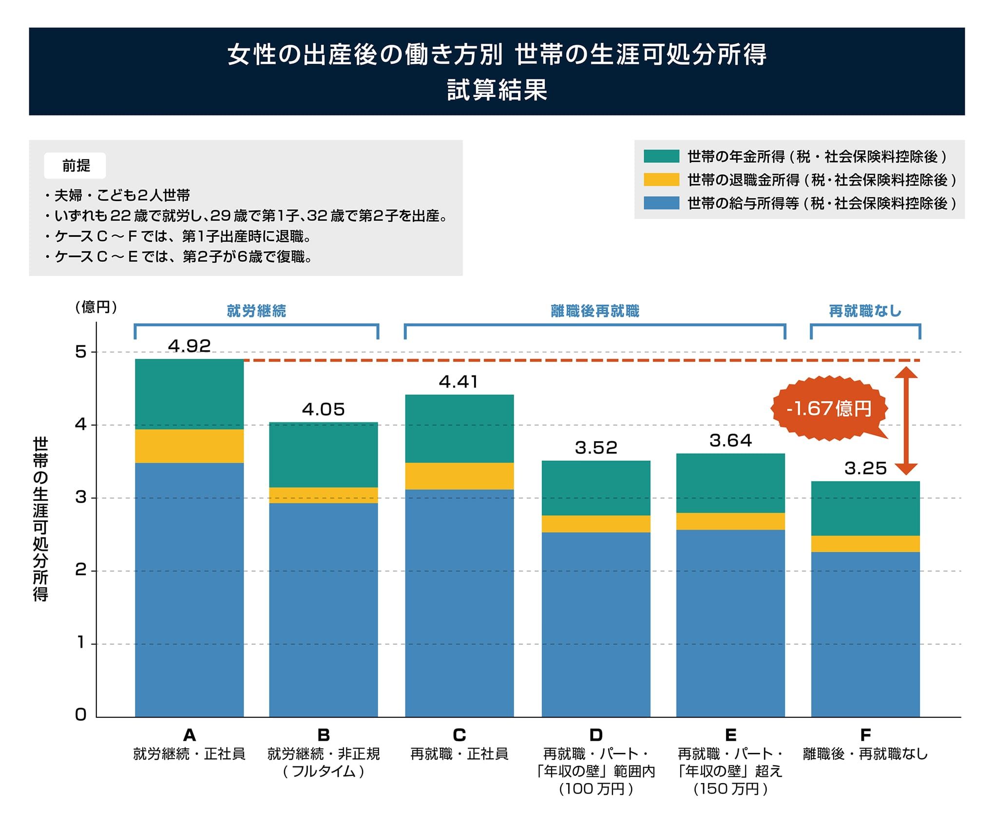 女性の正規雇用比率は、25~29歳をピークに年代が上がるとともに低下する「L字カーブ」が全国的にみられ※、仕事と育児などの両立の難しさがうかがえます。また、世帯の生涯可処分所得は、出産後の女性の働き方によって大きく変わることが内閣府で試算されています。