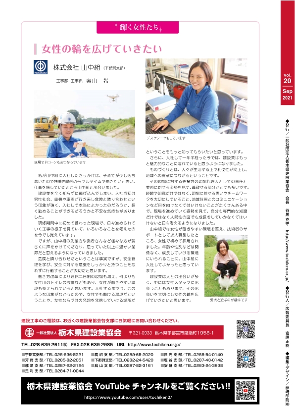 栃木県建設業協会では、毎年2回機関誌「Bratto」を6500部発刊し、関係機関だけでなく、フリーペーパーとして“道の駅”などにも置いていただいておりますが、直近の10年間では、裏表紙一面で現場の第一線で活躍している女性技術者を紹介しています。